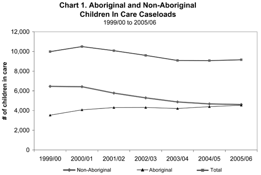 The number of children in care decreased by 13.6 per cent from 2000/01 to 2004/05, while increasing slightly in 2005/06. The number of Aboriginal children in care has increased while the number of non-Aboriginal children in care has decreased. See Chart 1.
